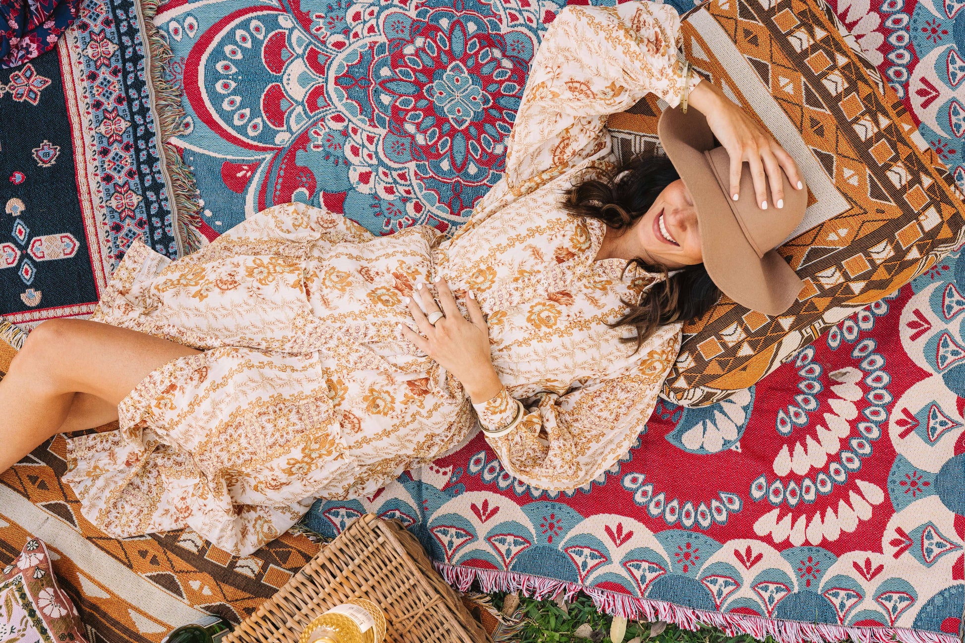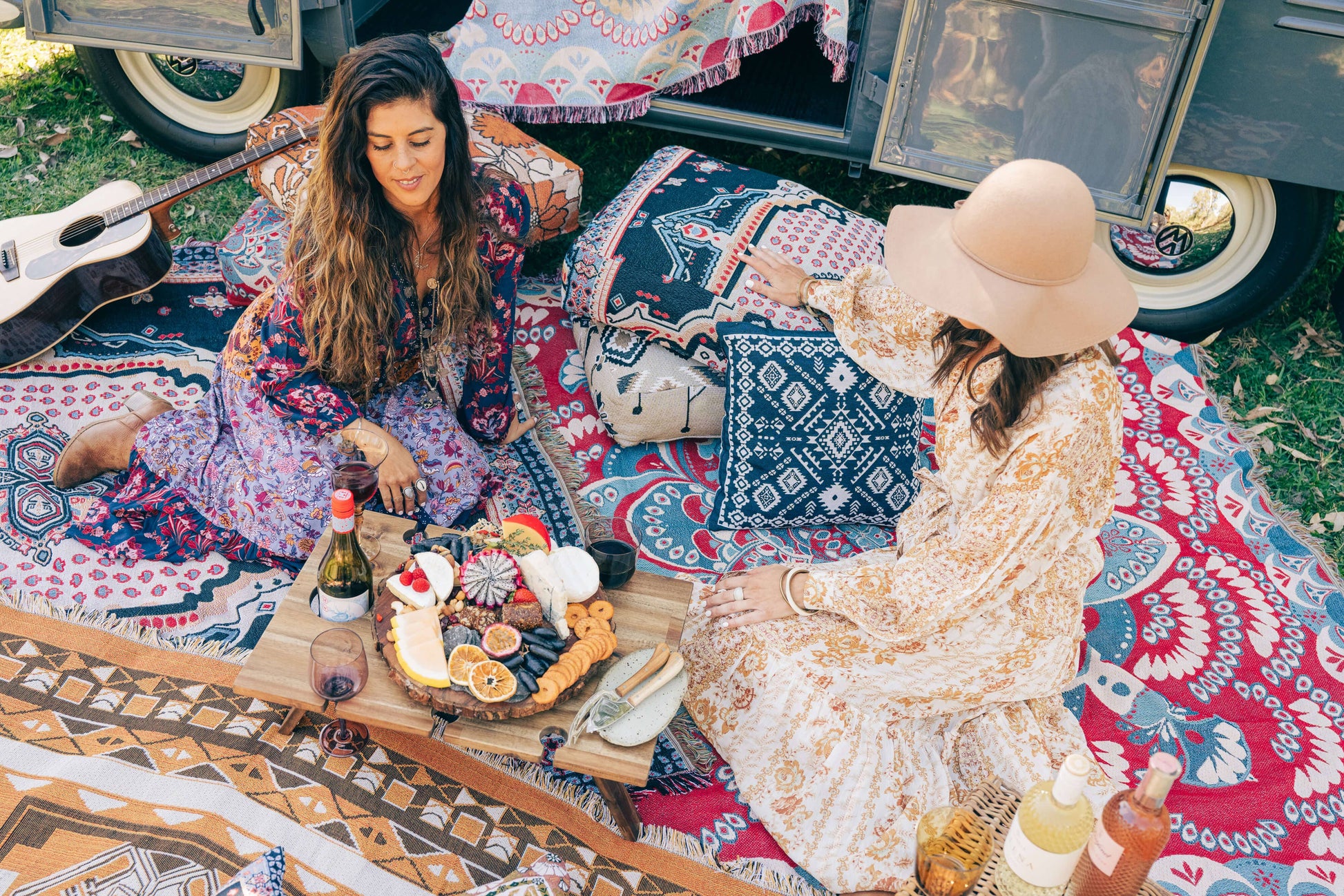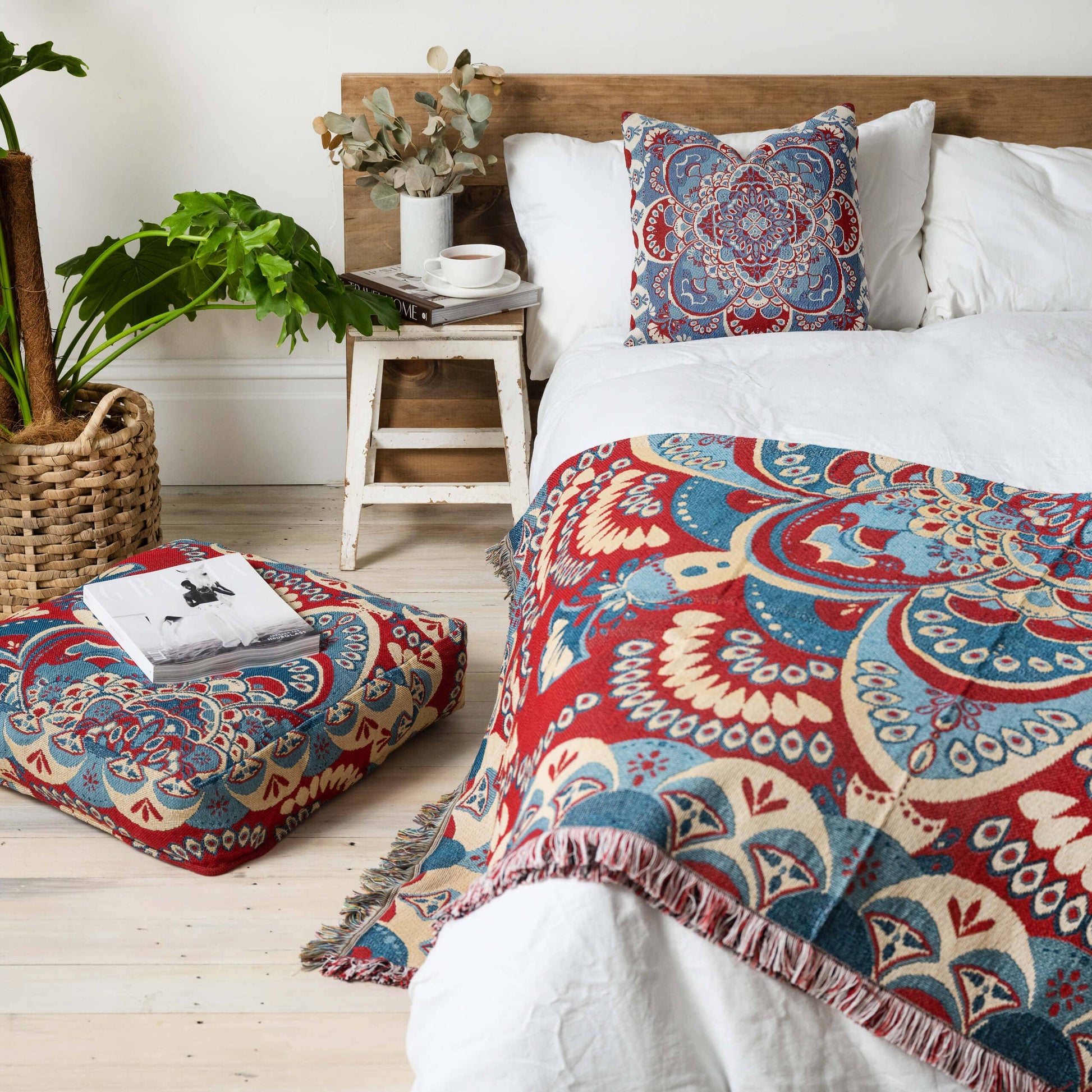 Our 'You'll Be Mine' picnic rug is an ornate kaleidoscope oriental-inspired design. It is emblazoned with intricate circular forms and scalloped shapes. It has a contrasting colour combination of dusty blues (almost denim) and a deep urban red, with lighter beige accents. Strong, bold and eclectic, this design will inspire boho picnics and bohemian interiors.